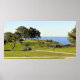 Uma rodada de golfe num dia lindo com o oceano ao fundo.