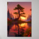 Uma árvore majestosa, dobrada num arco gracioso, fica orgulhosa pelo rio pacífico. Toda a paisagem é banhada no brilho quente de um pôr do sol laranja, criando um tableau de serenidade e beleza que captura a essência da tranquilidade da natureza.