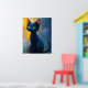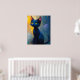 A stylized digital painting of a black cat with piercing yellow eyes, seated against a moody abstract background of teal, blue, and orange. The expressive brushstrokes and shadowy tones evoke mystery and elegance. This piece blends realism with atmosphere, perfect for lovers of feline art and dark aesthetics.