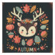 Esta design apresenta um adorável, capricho-branco que veste galhadas feitas de folhas e flores do outono. O porco é o centro, cercado por elementos temáticos do outono, como bolotas, pinheiros, folhas coloridas, maçãs e bagas. Um pássaro giro também aparece, aumentando a atmosfera acolhedora da floresta. A ilustração tem uma paleta de cor suave, muda, de laranjas, castanhos, vermelhos e azuis, evocando a sensação quente e rústica de queda. A palavra "Outono" é escrita em uma escrita divertida na parte inferior, completando o design.