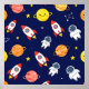 Blast off into a world of wonder with this adorable space-themed pattern perfect for little dreamers. Cheerful smiling planets in bright yellow, orange, pink, and peach float alongside red rockets zooming through the stars, cute floating astronauts, twinkling yellow stars, and constellation lines on a deep navy blue background. The playful, cartoon style and vibrant colors create a joyful, imaginative mood that's out of this world.