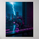 Transform your gaming setup with this futuristic cyberpunk gaming headset poster, crafted in a clean, high-contrast style. Featuring a sleek headset glowing in neon pink and blue, the design is set on a black desk reflecting the lights of a distant neon cityscape through a rain-streaked window. A subtle bolt of neon blue lightning illuminates the sky, casting a soft glow on the window, while faint pixel particles add to the cyberpunk atmosphere. Perfect for gamers who love neon aesthetics and futuristic decor, this artwork will bring a bold, immersive vibe to your gaming room.