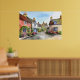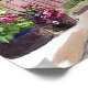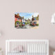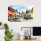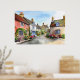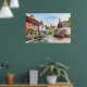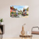 Poster de casacos encantadores com fachadas coloridas, uma rua quintal de uma vila, cercada por jardins vibrantes e repletos de flores. Um céu azul completa a cena idílica e pacífica.