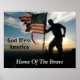 Este poster patriótico diz, "América Deus abençoe Casa dos Corajosos." Mostra uma foto da silhueta de um jovem militar com a mão sobre uma bandeira americana meteorizada no topo de uma montanha. Atrás deste soldado e desta bandeira está um belo pôr do sol. Esta fotografia foi tirada pelo meu filho, David Mann.