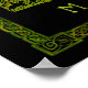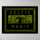 Cercada por uma borda de nós Celtas, uma floresta mística estilizada e cavaleira em tons de verde.
