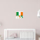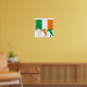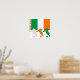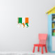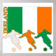 Três jogadores de futebol jogam em frente à bandeira irlandesa. Nome do país Irlanda está do lado