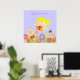 três fadas voaram acima das flores. Há um fundo roxo leve, e palavras roxas que podem ser personalizadas.