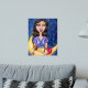Este pôster de arte tem uma imagem fantástica de uma linda dama de cabelos escuros em uma camisola roxa segurando uma lua crescente amarela adormecida com rosto e lábios rosados sob um céu noturno azul profundo com estrelas brancas.