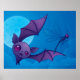 Ilustração de desenho animado de um morcego fofo perseguindo uma mosca-damselha sob uma lua de cheio.
