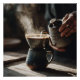 Thick aromatic steam billows upward as a steady stream of hot water pours from a hand-thrown ceramic kettle into a ribbed dripper perched on a matching stoneware mug. Deep blue-black glaze catches warm side light, revealing every textured imperfection and handmade beauty of the pottery. This intimate slow-brew moment captures the quiet joy of mindful coffee making, perfect for kitchen wall art, canvas prints, mugs, aprons, mousepads, tea towels, and décor that honors the simple ritual of a perfect cup.