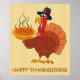 Peru de Ação de Graças segurando uma torta vestindo um chapéu de peregrino com texto... Feliz poster de Ação de Graças