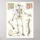 Carta anatômica mostrando os ossos do corpo. Uma visão superior do esqueleto. Vista lateral da coluna. Seção transversal do osso compacto. Os ossos estão rotulados.