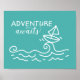 Este adorável pôster é perfeito para a criança (ou adulto) em sua vida que está cheia de aventura. Este design apresenta um barco à vela navegando alto nas ondas e o texto "A AVENTURA espera" em uma combinação de fontes brancas, tudo em um fundo azul aqua. Também disponível em roxo.