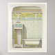 Uma bela ilustração de um banheiro vitoriano decorado em blues, verdes e dourados.
