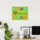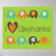 Um lindo pôster de berçário com design de elefante, ótimo para o quarto do bebê ou para o quarto de uma criança mais velha, apresenta oito elefantes em laranja, azul-turquesa e marrom em um fundo verde-limão com o texto Eu (coração) Elefantes!