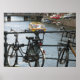 Os Bicicletas de Amsterdã estacionaram em uma Ponte de Amsterdã, no Fundo um Barco do Canal Amarelo com uma Bandeira Holandesa (Vermelha, Branca, Azul) no Canal com Reflexões à Luz do Sol no Impressão de Poster de Água. Uma Foto Atmosfera Holandesa Excelente, Totalmente Personalizável! Adicione suas próprias imagens e textos, se desejar!