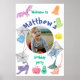 poster de boas-vindas festa de aniversário com motivos ilustrados de Halloween. No centro você pode personalizar o poster com o favorito do seu bebê e pode modificar todo o texto que aparece. Na parte de trás, uma impressão com fantasmas engraçados voando. (Foto cortesia de Alvin Mahmudov da Unsplash.)
