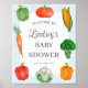 Um chá de boas-vindas ao mercado de fazendeiros. Design apresenta legumes pintados manualmente com aquarelas em um fundo de gingham azul pastel.