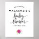 Um poster de boas-vindas preto e rosa-chic, preto e rosa, com uma elegante letra escrita com letra de estilo escrita e uma imagem de cor-de-água de rosas cor-de-rosa com folhas verdes. Personalize essa poster com o nome da mãe esperada e a data do evento.