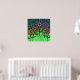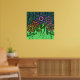 Esta poster tem flores de fantasia coloridas, grama, e ramos salgueiros brilhando em frente a um céu escuro à noite.