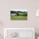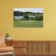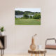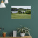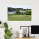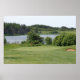 Um buraco de golfe muito cênico, mostrando verde, bunker, bandeira, árvores e água no fundo. Você pode mudar qualquer parte do poster que quiser, pois é um poster de mergulho.
