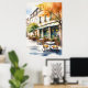 A poster de um charmoso café ao ar livre é representada com várias cadeiras vazias e mesas redondas, colocadas contra o pano de fundo de um edifício fino, de dois andares, adornada com tolices verdes e uma folhagem vibrante. Luz suave e quente adiciona um ambiente de boas-vindas à cena.