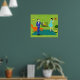 Este Poster Moderno Meio século de Casal parece uma cena de uma comédia romântica. A design de arte minimalista ao estilo de 1960 apresenta um casal de desenho animado atraente desfrutando de uma noite romântica em casa. A sala sofisticada destaca uma parede verde de pedra com um fogo em chamas na lareira. Os fornos na sala incluem uma cadeira laranja, salgada com bancada correspondente, um relógio vermelho, starburst wall, um monitor amarelo, sputnik, e uma mesa lateral laranja, que abriga um gravador verde e portátil. No chão ao lado da mesa final, um registro de vinil pode ser visto saindo de um cobrir de álbum de kitschy. No centro do chão verde, há um tapete grande, retangular, lacrimogêneo. No meio da cena, temos um casal muito sofisticado. Há um homem suave em um terno azul real, camisa branca e gravata arco azul. O homem alto, escuro e bonito está olhando para seu adorável companheiro. A elegante mulher cabeleira está vestindo um vestido de aqua flouncy. Cada um deles segurando um vidro de cristal martini com uma azeitona flutuante. Saúde! Aqui está a noite perfeita em casa!
