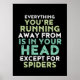 Engraçada e humorada citação inspiracional e motivacional poster sobre ser corajoso e conquistar seu medo. Tudo de que você está fugindo está na sua cabeça. Exceto aranhas. Aranhas são sempre reais. A cor de fundo pode ser personalizada para a cor desejada.