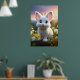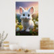 Poster de um coelho branco giro com olhos azuis grandes e pelúcia lisa em meio a flores brancas e folhagem verde, com um pôr do sol macio ao fundo. A cena evoca um senso de calor e serenidade.