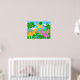 Poster de cor dos dinossauros da selva. Dinossauros de cartoons bonitos: T-Rex cor-de-laranja e rosa, Parasaurolofo azul e Pteranodon voador amarelo numa paisagem pré-histórica da selva com palmeiras e montanhas com estrelas poster impressão. Este poster de dinossauros é totalmente personalizável, adicione seus textos e imagens. Um presente de poster colorido excelente para um para um pequeno grande fã de dino!