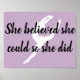 Ela acreditava que poderia, assim o fez, está escrito em bonito escrita a pincelada negra sobre um fundo púrpura pálido. Uma silhueta branca de uma dançarina dando um salto é vista ao fundo. Não gosta do fundo roxo? Você pode escolher sua própria cor clicando no link personalizar.