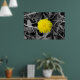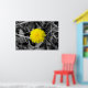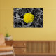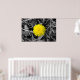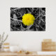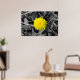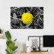 Este poster apresenta um dandelion amarelo brilhante contra um fundo preto e branco de folhas de outono e grama.