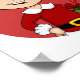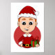 Design com a ilustração de um menino feliz sorridente com cabelo ruivo, o menino está vestindo uma fantasia de Santa Cláusula com chapéu vermelho e segurando um presente; em círculo vermelho sobre fundo branco