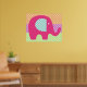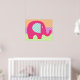 Um poster de berçário colorido apresenta um elefante rosa brilhante com orelhas pontilhadas em brasa e brancas e um fundo com cor de laranja, lavanda e verde pontilhado.
