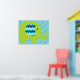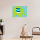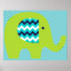 Um poster de berçário colorido apresenta um elefante verde limão brilhante com orelhas de stripe de chevron, brancas e marinhos e um fundo com riscas brancas e azuis de cor diagonal.