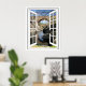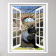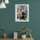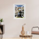 Linda vista de janela da ponte rustica com rio fluindo e céu azul. Imagem de exibição de ponte antiga através da janela no poster personalizado.