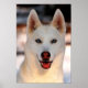 Casaca Siberiana branca espantosa, com olhos azuis, orelhas encharcadas, encarando hetero na câmera. Este cão de trenó é um retrato fotográfico do cachorro perfeito, capaz de correr o dia todo e bem em temperaturas até 60 abaixo de zero, Farenheit. Se você ama raças nortes e cães de trenó, você admira isso todos os dias.