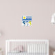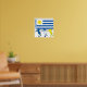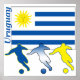 Três jogadores de futebol jogam em frente à bandeira uruguaia. Nome do país Uruguai está do lado
