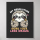 Poster com o encantador tema da preguiça com a citação "Minha Resolução: Mais Yoga Menos Drama" em cores pastéis em um fundo escuro. Arte perfeita para os entusiastas do ioga, amantes da mente ou fãs de preguiça que apreciam designs divertidos e motivacionais.