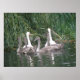 Esta poster apresenta uma bela fotografia de um par de cisnes adultas e dos seus 4 ciganos a nadar à distância ao longo de um calmo rio pacífico.