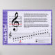 Este Poster de Limpeza de Tremores mostra as notas do decote de Tremores em notação padrão. O poster contém informações úteis sobre o clave e seu uso diário e contém alguns mnemônicos úteis para lembrar as notas de clave de trecho. A metade inferior da poster mostra as notas da salva de triplo, com o centro C destacado.