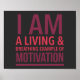 Tipografia que diz que sou um exemplo vivo e respirador de motivação. Poster motivacional com fundo preto.