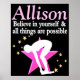 Seu incrível Nadador vai amar essa inspiradora Crença personalizada em você e todas as coisas são possíveis Nadar poster. Aprecie seu maravilhoso nadador com essa fantástica Poster de Nadação de Meninas para motivá-la e encorajá-la a sempre sair e fazer o seu melhor. Esta Poster de Nadadora personalizada é o presente perfeito para os aniversários, feriados, ou qualquer ocasião, e ficará bonita pendurada na parede do quarto. Seu nadador número um ficará entusiasmado com esta Poster de natação única e original da garota.