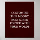 Eleve qualquer espaço com este poster/sinal personalizável, com um fundo vermelho-rústico escuro projetado por Toni. Este fundo é de uma pintura digital original, de modo que tem mais profundidade e interesse do que apenas um fundo de cor simples. O pano de fundo exclusivo para a sua citação ou informação personalizada faz com que o seu texto personalizado se sobressaia perfeitamente. Quer queiram mostrar uma citação favorita, verso bíblia, detalhes de eventos ou um ditado significativo, este impressão personalizável permite-vos dar vida às suas palavras de uma forma ousada e artística. Uma mistura perfeita de humor e singularidade, esta design transforma qualquer mensagem numa espantosa peça visual central. Clique em "Personalizar este design" para adicionar a sua citação e/ou clique em "Editar usando a ferramenta design" para alterar o texto e a cor do texto. O cenário continuará o mesmo. As fotos do Mockup mostrarão exemplos desse poster enquadrado/com correspondência. Você receberá apenas impressão ou download digital. Procure na minha loja mais fundos exclusivos para personalizar posters. Estes designs só foram encontrados no meu compro! Obrigado pelo seu interesse, agradeço o seu negócio!