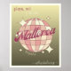 O poster de decoração de parede apresenta uma bola de disco cor-de-rosa com "Mallorca" gravada em fundo de gradiente dourado, juntamente com as palavras "playa, sol y fiesta" e "islas baleares". As frases de texto são personalizáveis de acordo com o desejo individual.