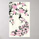 Impressão de poster preto, rosa, pavão e cereja floresce personalizado, apresentando uma silhueta de pássaro de pavão e um galho de cereja - sakura - com flores adoráveis em fundo de marfim. Um design com um talento asiático oriental. Cores: Preto, rosa, marfim. rba