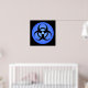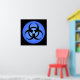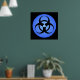 Símbolo de risco biológico preto sobre fundo azul circular.