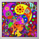 Flores hippie coloridas retrógradas e brilhantes com um cão escondido. Para uma pintura de parede mais colorida visite o resto deste compro!