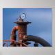 Aparência sentada atrás do metro e sobre uma velha máquina vermelha e enferrujada usada para verificar a pressão do ar no início da noite em agosto