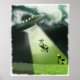 Uma ilustração cômica de uma vaca sendo sequestrada por um OVNI